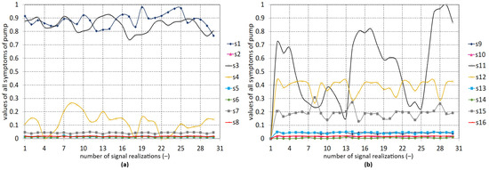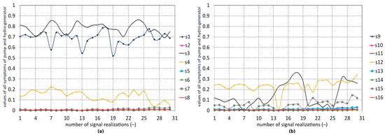 The presentation of symptoms for the operation of the pump and the hydrogenerator are similar to those for the pump and the hydrogenerator in their separate operation. Most symptoms have low values, and there are few differences (Figure 12a,b).