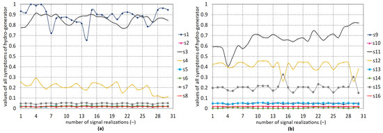 From Figure 11a,b, which show the operation of the motor and hydrogenerator, it is possible to derive a similar partial result as that for the motor and pump operation. The motor and its vibration signal represent an aggregate that, by its operation, fundamentally affects the vibration signals and symptoms of the other units, such as the pump and hydrogenerator.