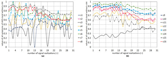 From Figure 13a,b, it can be concluded that individual symptom differences are good if all aggregates are active. A strong fluctuation is only observed for .
