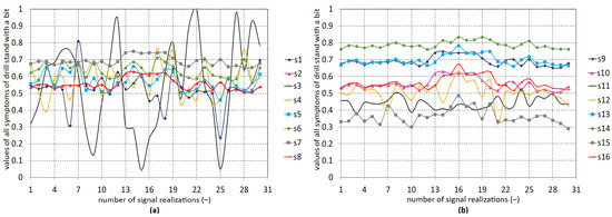 The important results and indicators are the presentation of the waveform of the symptom values for one aggregate of the drilling stand. Therefore, their plot is essential from the point of view of efficiency of the classification and differentiability of the sought symptoms (see Figure 7, Figure 8, Figure 9, Figure 10, Figure 11, Figure 12, Figure 13 and Figure 14).