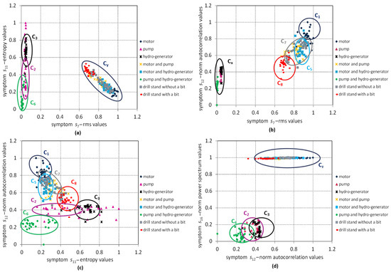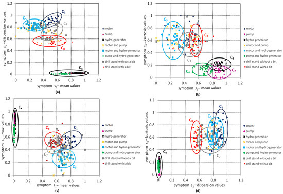 Figure 15 shows the positions of the symptom vectors of the objects in the two-dimensional symptom plane that form individual clusters. Clusters of objects form calculated symptoms from N = 30 realizations of the vibration signal of all aggregates. Individual aggregates as objects (i.e., ) of the drilling stand have their own defined part of the symptom space. However, the border between them is not sharp, and there is mutual overlap and the emergence of penetrations between clusters. When viewed in a two-dimensional symptom plane with symptoms and , five clusters can be formed (see Figure 15a). Relatively good differentiability of clusters is possible for aggregates such as the motor (C), the motor and hydrogenerator (C), the drilling stand without a drill bit (C), and the drilling stand with a drill bit (C). The cluster (C) represents a group of pump aggregates, the hydrogenerator, and their joint activity. Creating their separate clusters is not quite possible. Creating a cluster for the motor and pump unit together as an object is impossible because its symptoms are extensive. Symptom values were found in multiple clusters. Figure 15b shows the symptoms and in the symptom plane. The significance of the partial results is that it is possible to create clusters from the objects of the pump (C), hydrogenerator (C), and their joint activity (C). Partial recognizability of objects through the clusters was noted for the motor and hydrogenerator (C), the drill stand without a drill bit (C), and the drill stand with a drill bit (C). The motor and the motor and pump together were hard to recognize. Similar results were obtained for symptoms and shown in the plane in Figure 15c and for symptoms , (see Figure 15d). Common features represent the possibility of creating a cluster (C) and further clusters (C, C, C,C). Another feature is a different distribution in the symptom plane.