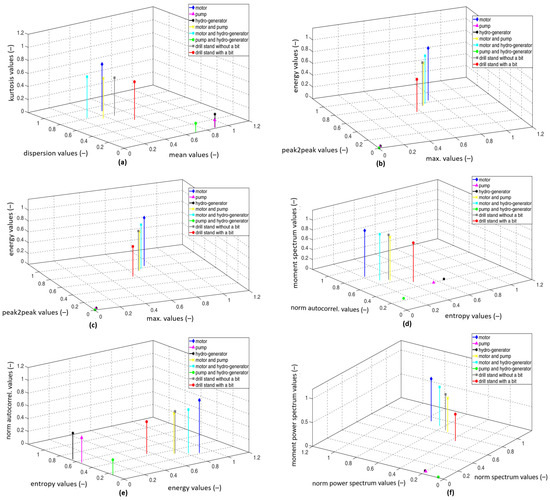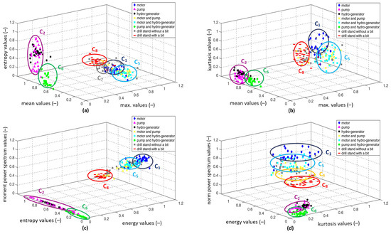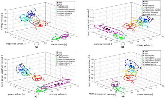 In the following section of the paper, Figure 17 shows the clusters of symptom vectors of the drill stand aggregates in the three-dimensional symptom space. For such a display, three symptoms were used, making it possible to assume the differentiability of the aggregates. From the many research results, only the representative ones were selected. This three-dimensional representation comprised the following symptoms, i.e., —mean values; —dispersion values; —energy values (see Figure 17a). There was sufficient diversity of the uniform clusters of aggregates created (i.e., C, C, C, C, C, and C). A cluster could not be created for the hydrogenerator, motor, and pump objects. This makes their classification more difficult. For Figure 17b, where the symptoms (i.e., —energy values; —entropy values; and -norm autocorrelation values) were displayed, it was possible to, at least partially, display the cluster (i.e., C—for the motor and pump together) despite being located between the two defined C and C. Similar results are provided in Figure 17c,d.