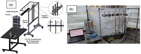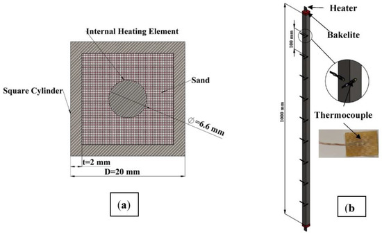 Figure 1 shows a schematic of the setup, which consists of a moving frame holding three vertical tubes of a 20 mm × 20 mm square cross-section forming a horizontal array. The center-to-center distance is S and the side length of the square cross-section is D (equivalent to hydraulic diameter) as shown in Figure 1. The experiment is performed on five S/D of 1.75, 2.75, 3.25, 3.75, and 4.25. Each tube is made from steel (polished mild steel) and filled with sand to insure uniform lateral conduction of heat, while a uniform heat flux heating element (ϕ = 6.6 mm) is inserted at the center of the cross-section of each tube, as shown in Figure 2a. Each tube has a 1.0 m length and is capped with Bakelite insulation with thermal conductivity of 0.15 W/m K [14] to reduce any leakage in the axial heat transfer from each tube. Self-adhesive thermocouples (type K, 30 AWG, 0.01-inch diameter) are used to measure the surface temperature of each tube at three different surfaces; right, left, and the front surface only for similarity. The thermocouples are placed 100 mm apart on each surface, as shown in Figure 2b. Therefore, each tube has 27 thermocouples, 9 at each surface area. The test rig is placed in a 4.4 m × 3.0 m room with no air conditioning or ventilation to ensure that the heat will be transferred from each tube surface only by natural convection. The room has only one entrance covered by a thick curtain. Thermocouples are connected to a data acquisition system, which in turn is connected to a computer, where the surface temperatures are stored for further analysis. A voltage regulator is used to control the input electrical power, which is measured by a Wattmeter and is shared equally between the tubes. It should be mentioned that the electrical power is increased such that the tube surface temperature does not exceed 100 °C.