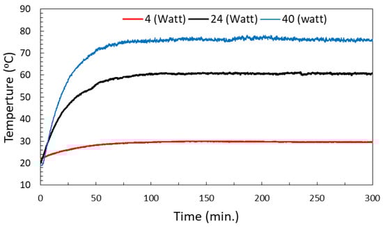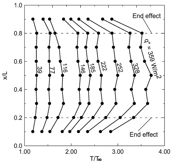 Figure 3 shows the local circumference average normalized temperature profiles along the outer surface of a single square tube at various heat fluxes. The end effect is clear on the temperature profiles at the up and downstream of heat transfer. Therefore, the test section will be focused on the vertical distance between x/L = 0.2–0.8. Other tubes give similar temperature profiles. It should be noted that the temperature reaches a steady state after about 100 min, as shown in Figure 4 at different supplied heating powers.