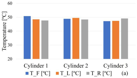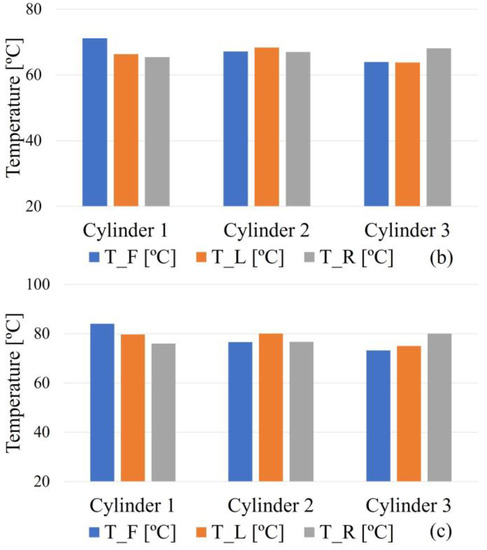 Figure 5a–c shows a sample of the temperature readings in the middle of the tube at the three surfaces, namely: front (F), left (L), and right (R) at three different heat fluxes. Table 2 shows the surface temperature, the mean value, and the standard deviation between the three different readings for each tube. As indicated, as the heat flux increases, the surface temperature increases and the maximum overall standard deviation is 3.30. The percent of overall relative standard deviation is obtained at the three heat fluxes as 2.34, 3.46, and 4.23, as shown in Table 2.