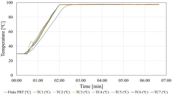 It should be noted that the thermocouples have been calibrated using a platinum resistance thermometer made by Fluke Corporation (Model: 5609). The thermocouples along with the Fluke thermometer were immersed in a container full of distilled water, which was then heated up to the boiling temperature. Temperature readings were recorded using a data logger. A sample of such measurement/calibration is shown in Figure 6 for seven thermocouples, and the boiling temperature for each thermocouple is shown in Table 3. These results ensure a very good accuracy of the used thermocouples. The boiling temperature corresponds to Riyadh’s atmospheric condition.