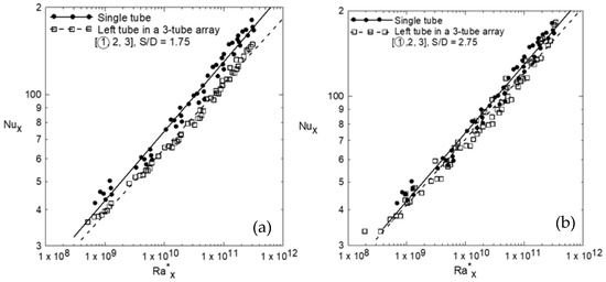 Figure 7 shows a comparison between the natural convection heat transfer from the three single tubes and that of Vliet and Liu [1] and Ali [2] for natural convection from vertical plates and vertical square cross-section tubes, respectively. The comparison shows that the current results lie between the envelope of Vliet and Liu [1] and Ali [2], and close to [2] since the current tubes have a square cross-section area similar to that of [2]. Figure 8a,b shows the local circumference averaged Nusselt number versus the modified local Rayleigh number on a logarithmic scale for the left tube (number 1, □) in an array of three tubes compared to that of the single tube ●. The solid and the dashed lines present the curve fitting through the experimental data. Figure 8a shows that for center-to-center distance ratio S/D = 1.75. It is clear that the effect of small S/D is to reduce the Nusselt number at the same . This could be attributed to the existence of small S/D since in general, there is competition between the raising plume due to the buoyancy force, which tends to improve the heat transfer coefficient, and the accumulated thermal boundary layer, which tends to degrade it. This competition depends on the S/D ratio. Therefore, as S/D increases, the velocity effect of the raising plume overcomes that of the accumulated thermal boundary layer, which reduces the difference in between the single tube and that of the array of three tubes, as shown in Figure 8b. Moreover, as S/D increases more, the of the tube in the array approaches that of a single tube and may enhance it over that of a single tube, as shown in Figure 9 for S/D = 4.25. Solid and dashed lines, which appear in Figure 9, present the curve fitting through the experimental data at different S/D ratios. The general correlation of the curve fitting is in the form