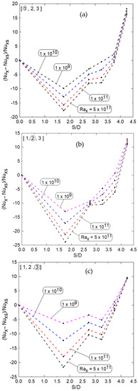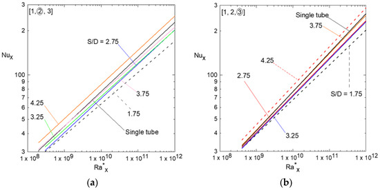 Figure 10a,b shows the effect of center-to-center distance on natural convection heat transfer, and it is clear that as the S/D increases, the effect of natural convection velocity presented by a rising plume overcomes the degradation effect by the accumulated thermal boundary layer on heat transfer from the tube. Figure 11a–c shows the Nusselt number profiles as a function of the S/D ratio for different Rayleigh numbers for the left tube (#1) in Figure 11a, the middle (#2) in Figure 11b, and the right (#3) in Figure 11c, respectively. These profiles show the initial degradation of Nu at the smaller S/D and then the enhancement starts as the S/D increases, as mentioned earlier due to the velocity effect of the raising plume overcoming that of the accumulated thermal boundary layer. It is also noted that as Rayleigh’s number increases, the Nusselt number profiles increase too, and the minimum degradation and maximum enhancement in Nu occur at S/D = 1.75 and 4.25, respectively. It should be noted that S/D = 0 in Figure 11 corresponds to that of natural convection from a single tube alone, and the rest is related to that of the tube in the array at different S/D. Figure 12a–c shows the percent of degradation and enhancement in local Nux as S/D increases for different Rayleigh numbers compared to that of a single tube (at S/D = 0). These results show that the percent of degradation increases as the Rax increases, as shown for S/D = 1.75; however, Rax has a low effect on Nux at large S/D = 4.25. Table 5 shows the percentage of degradation or enhancement over the single tube for the three tubes in the array at different S/D as shown in Figure 12a–c.