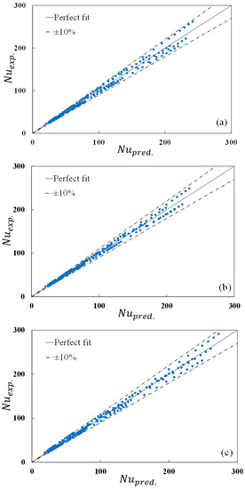 C1, C2, C3, and the coefficient of determination R2 are shown in Table 6. Figure 13a–c shows differences between the predicted and the experimental Nusselt numbers with S/D as a parameter using a correlation number (13). The maximum deviation, which appears at high Rayleigh numbers, is shown in Table 6. Figure 14 shows a maximum difference of 17.9% between the predicted and the experimental Nusselt numbers using both S/D and the tube’s number (n) as parameters. The overall correlation for the array is obtained as: