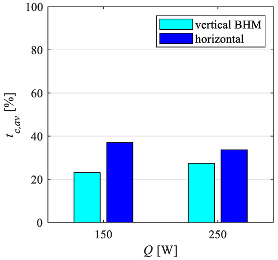 - The higher average activity of channels found in the vertical bottom heated mode confirms its better heat transfer capability with respect to the horizontal orientation, even though values of tc,av equal to 23 and 27% of the total observation window at average and high heat loads, respectively, highlight a lower continuity of fluid oscillations in the vertical operation;