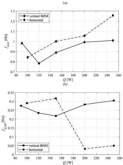 - The generally greater continuity of oscillations in the horizontal orientation is also established by the fd,std values, which suggest more similar dominant fluid oscillation frequencies among the device branches especially at high heat loads, where fd,std is set below 0.05 Hz;