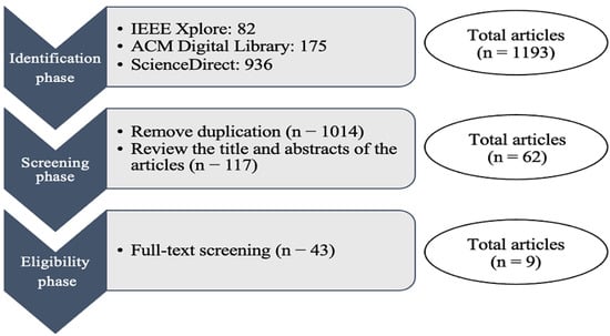 Figure 2 shows the PRISMA flow diagram [30] for a systematic review of the security aspects of chatbots. There are three phases involved (identification, screening, and eligibility phases). During the initial identification phase, we retrieved 1193 articles from the electronic database search. After removing duplicates, 179 articles remained. The screening phase involved reviewing the titles and abstracts of the articles, resulting in the exclusion of 62 articles. During the eligibility phase, full-text screening was conducted on the remaining 19 articles, and 10 articles were excluded for not meeting the inclusion criteria.
