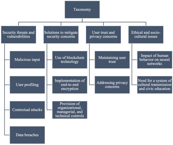 Figure 4 depicts the taxonomy of information security in chatbots that we developed based on the information in Table 3. The taxonomy is used to provide a framework for understanding the different aspects of information security in chatbots and to help identify gaps and areas for further research. In general, the common themes and patterns identified across the literature on chatbot security can be classified into four themes: Themes 1: Security threats and vulnerabilities; 2: Solutions to mitigate security concerns; 3: User trust and privacy concerns; and 4: Ethical and socio-cultural issues. Theme 1 covers four aspects, and they are malicious input, user profiling, contextual attacks, and data breaches. Theme 2 covers three aspects: the use of blockchain technology, the implementation of end-to-end encryption, and the provision of organizational, managerial, and technical controls. Theme 3 covers two aspects: maintaining user trust and addressing privacy concerns. Theme 4 also covers two aspects: the impact of human behavior on neural networks and the need for a system of cultural transmission and civic education.