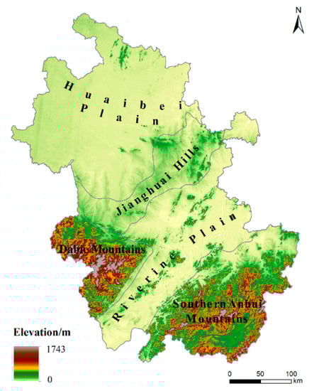 Anhui Province, located in eastern China, has coordinates of 114°54′~119°37′ E and 29°41′~34°38′ N, covering a total area of 1.4 × 105 km2 The province belongs to the transition area between the warm temperate zone and subtropical zone, characterized by an average temperature of 14–18 °C and annual precipitation of 800–1800 mm. With elevations ranging from 0 to 1743 m, Anhui Province’s topography exhibits a “high in the south and low in the north” pattern (Figure 1). The southern and Dabie Mountains are mountainous areas dominated by woodlands, while the Huabei Plain and Jianghuai Hills serve as centers for human activities.