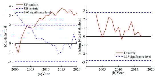(a) Mann–Kendall test for EQI; (b) Sliding t-test for EQI.