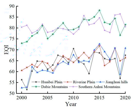 Interannual variation in EQI during the growing season in Anhui Province, 2000–2020.