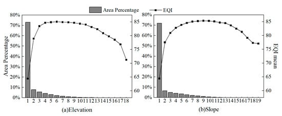 Relationship of EQI with elevation (a) and slope (b) in Anhui Province. (a) where 1–19 represent the elevation bands 0–100 m 100–200 m … 1700–1800 m, respectively, (b) where 1–31 represent slope bands 0–2°, 2–4°, 4–6°, respectively … 36–38°.
