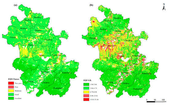 EQI classes (a) and standard deviations (b) of growing season in Anhui Province, 2000–2020.