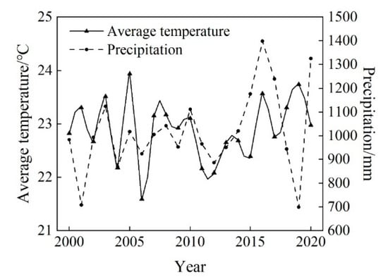 Average temperature and precipitation of growing season in Anhui Province, 2000–2020.