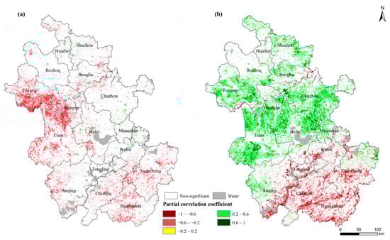 Distribution of partial correlation coefficients between EQI and average temperature (a) and precipitation (b) during the growing season in Anhui Province, 2000–2020.