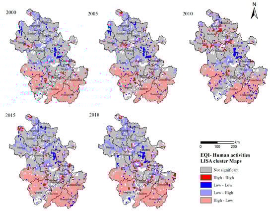 Local spatial clustering of EQI and human activities, 2000–2018.
