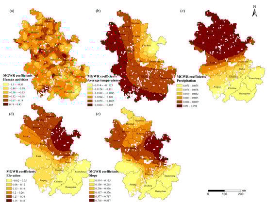 Spatial distribution of MGWR regression coefficients for human activity (a), average temperature (b), precipitation (c), elevation (d) and slop (e) in 2018.