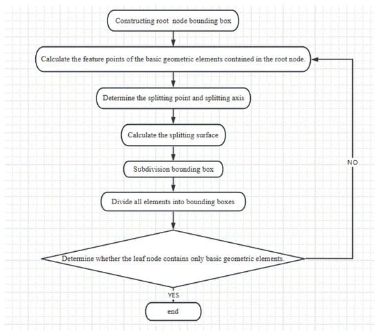 As a logical structure, the bounding volume hierarchy is also a hierarchical structure, which has the following two characteristics: the root node of the tree has no precursor, and all nodes except the root node only have one precursor; all nodes in the tree can have 0 or more successors. For a balanced m-ary tree with n nodes, the time spent traversing a tree is . When , is the smallest. In summary, the tree structure of this study was a binary tree. In order to construct it conveniently, this study chose the top-down method with the highest perfection to construct the binary tree. The core problems of the top-down construction method were how to determine the split plane and maximize the adjacent geometric elements in the space into the same subspace, and a split point and a split axis can determine the split plane. For the splitting axis, according to calculations of the variance of the triangular surface axis, the axis with the largest variance is the splitting axis. As the splitting point, we can take the average value of the coordinates of the projection points on the splitting axis of the midpoint of all the triangular primitives in the bounding box.
