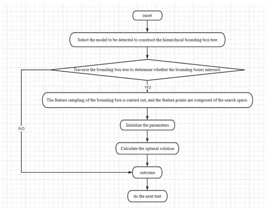 In the preliminary detection stage, the spherical and OBB bounding boxes are selected, the binary tree is selected as the tree structure and the Bounding Volume Hierarchy is constructed in a top-down manner. The depth-first traversal method is used to traverse the tree’s structure, and the triangular primitive pairs without a collision are quickly removed. In the accurate detection stage, the bounding box with a collision after preliminary detection is processed by random sampling to form a search space composed of feature pairs. The optimized ant colony algorithm is introduced to solve the optimization problem of the search space, as shown in Figure 2. The specific steps are as follows: