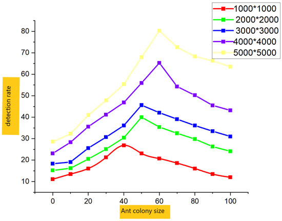It can be seen from Figure 3 that different sizes of the ant colony had a great influence on the detection rate of the algorithm, and the detection rate maintained the law of decreasing first and then increasing. When the number of feature pairs was 10002, the highest detection rate could be obtained if the number of ant colonies was 40. When the number of feature pairs was 20002 and 30002, the highest detection rate could be obtained if the number of ant colonies was 50. The highest detection rate could be obtained when the number of feature pairs was 40002 and 50002 if the number of ant colonies was 60.