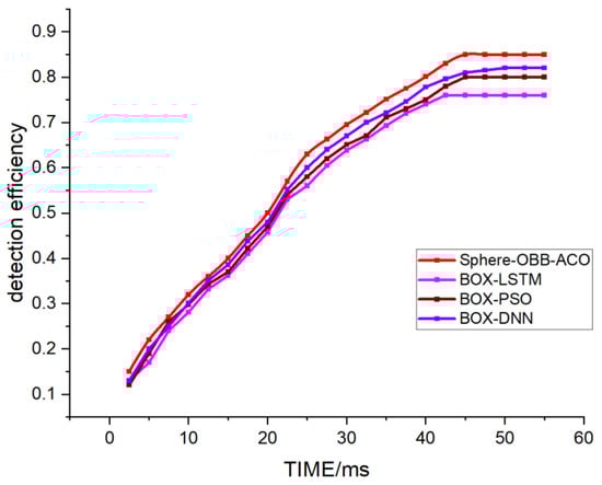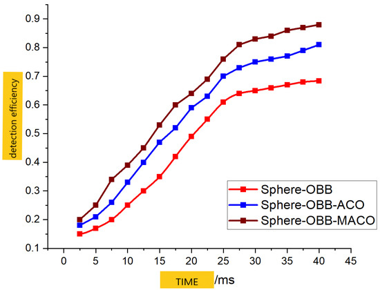 From Figure 4, it can be seen that all three algorithms achieved stable results after 30 ms. Among them, the detection rate of the sphere-OBB-MACO algorithm was the highest (about 0.85) and sphere-OBB was the worst (about 0.65).