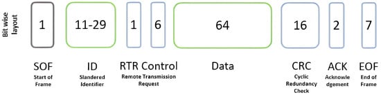 The CAN bus frame consists of four types: data frame, error frame, overload frame, and remote frame [2]. Each of these frames has a standard structure that includes different fields: arbitration identifier, data, acknowledgment, and others. The definition of each field of a CAN frame is shown in Figure 1. The start of frame (SOF) indicates the beginning of a CAN message with a dominant bit, and it informs all nodes to begin CAN message transmission. The arbitration field consists of 11 bits, which can be expanded to 29 bits. The control field, also known as the check field, provides data from the receiver to check if all transmitted packets are working properly. The data field contains actual information for CAN nodes to perform actions and can be 8 bytes. The CRC field, also known as the cyclic redundancy code or security field, is a 15-bit error detection tool that checks for packet validity. The acknowledge (ACK) field, also known as the confirmation field, ensures that the receiver nodes have received the CAN packet correctly. If an error is detected during the transmission process, the transmitter is promptly notified by the receiver to resend their data packets. The EOF field indicates the end of the CAN datasets with a flag of a dormant bit. Data frames are used to transfer CAN packet information (Request Command) from the sender. Therefore, the CAN bus communicates with other nodes by transmitting packets through data frames. Whenever the remote transmission request (RTR) bit is flagged as dominant, it becomes a CAN data frame.