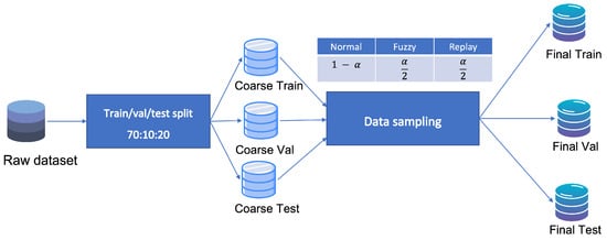 After being preprocessed, the dataset is then spitted into three non-overlap subsets including training, validation, and test sets. However, we observed that the class distribution in the raw dataset does not match with the real environment, which means there are large attack samples over the normal samples. The ratio between the total number of attack samples over the total number of the dataset is defined as the attack density. Then, a data sampling process (Figure 6) is performed to ensure an attack density in the experimental environment, in which the attack density is uniformly chosen in range . Table 3 shows the details of training data having approximately 50k samples in total after sampling. While the deep learning model is developed by Python 3.9 and Pytorch 1.12, the Flower framework [43] is used for demonstrating the federated learning scheme. In addition, all the experiments run on a server provided with 32 Intel(R) Xeon(R) Silver 4108 CPUs @ 1.80 GHz, a memory of 128 GB, and an Nvidia Titan RTX 24 GB GPU.