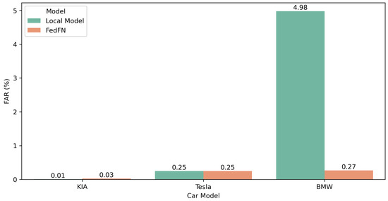 As illustrated in Table 4, the F1 scores of Fed-FN models are much higher than those of the local, at 0.9893 on average. In general, Fed-FN increases the recall scores significantly for all examined car models. It should be noticed that the recall metric is more important than the precision in the case of an intrusion detection system, as the consequence of false negative cases are worse than that of false positive cases. What stands out in the result is that transfer learning from the global model increases the F1 score of the BMW car’s local model by approximately 1.0, which helps the model satisfy the accuracy constraint for deployment. The primary reason for the suboptimal performance of the local model in BMW cars is their unique electronic architecture, wherein data generation usually exhibits a proportional relationship between the number of ECUs and CAN IDs. In contrast to other car models, BMW has a higher number of CAN IDs and lower data generation frequency shown in Table 1. This indicates a low command frequency and a high command interval time, which could contribute to the less responsive system and the inferior local model performance of BMW compared to other car models. Though modifying federated deep learning hyperparameters can improve BMW’s accuracy, it may lead to complexity. Using a global model instead of customizing hyperparameters can improve accuracy without adding complexity. Sharing ideas between local and global models can improve accuracy rates. In addition, the results of the Fed model are shown to demonstrate the essentials of the fine-tuning step. We can see that the Fed model produces the lowest F1 score due to the effect of data heterogeneity. Furthermore, the proposed system decreases the ER and FAR of local models significantly, especially in the case of the BMW (see Figure 7 and Figure 8).