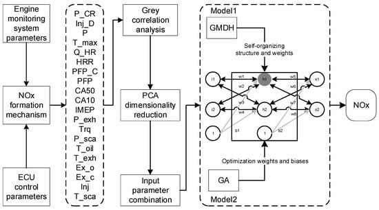 Firstly, from the perspective of control, the relevant factors were initially selected as alternative input parameters for the NOx release model according to the mechanism of NOx formation during diesel engine operation and the controllable factors affecting NOx formation. Then, the Pearson correlation coefficient and grey relational analysis correlation methods are used to correlate the relevant parameters, and principal component analysis is used to reduce the dimensionality of the influencing factors to obtain the input parameter combinations of the model. In this way, the input data can be reduced in dimensionality with the minimum loss of important information, thus reducing the complexity of the whole model. Finally, the structure of the BP neural network is optimized adaptively using GMDH to improve the accuracy of the model. In addition, the weights and biases of the BPNN are optimized using a genetic algorithm and used as a comparison model; and the unimproved BPNN is used as another comparison model.