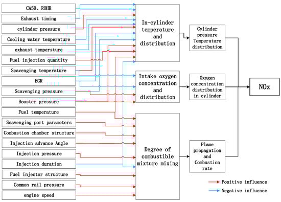 According to the data, the NOx content of exhaust emissions produced by the marine low-speed diesel engine burning heavy oil (HFO) is 8.7% according to the mass ratio (NOx/HFO) [37]. The NOx is divided into the thermal type (83.92%), fuel type (11.08%), and fast type (5%) [38]. For the research on the formation mechanism of NOx, the thermal NOx formation explanation of the Zeldovich mechanism is widely recognized. This mechanism clarifies that NOx is produced by the chemical reaction of and in the combustion mixture. Since NOx is a product of combustion, the relevant parameters of the scavenging process, compression, fuel injection, combustion process, and structural characteristics of the marine diesel engine will affect the combustion and then affect the formation of NOx. From the formation mechanism of the thermal NOx chemical reaction, it is known that the distribution of temperature and pressure in the cylinder, the concentration and distribution of oxygen, and the flame propagation rate control the formation of NOx. The impact relationship of structural parameters, initial state parameters, working process parameters, and typical performance characteristic parameters involved in these three conditions in NOx generation are outlined in Figure 3.
