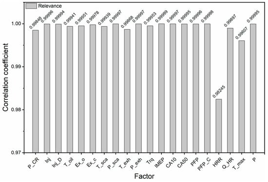 Many factors affect the formation of NOx. Selecting appropriate input parameters can reduce the computational complexity of the NOx simulation model and achive higher accuracy. Therefore, it is necessary to further analyze the degree of influence between related factors and NOx formation and describe the correlation quantitatively. Since this paper takes the 6EX340EF engine as the research object, its relevant structural parameters will not change during use, so the correlation with NOx is not considered. A certain number of data samples for the working parameters and performance parameters of the engine under different control parameters are designed by the simulation experiment, and the influencing factors present a normal distribution. Therefore, the commonly used Pearson correlation coefficient and grey relational analysis correlation methods were used to correlate the relevant variables; the results using the Pearson correlation coefficient are shown in Table 3, and the results of the grey relational analysis are shown in Figure 4.