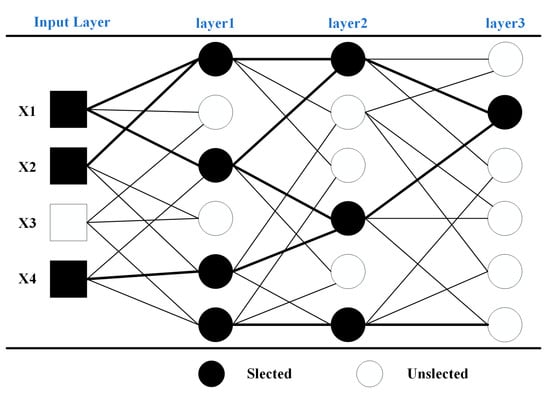 The GMDH is a heuristic self-organizing method to study the relationship between variables. It can be used to select and classify input parameters to reduce the dimension of input features. For example, when there are three layers and four inputs, the sample architecture of the GMDH algorithm is shown in Figure 6. In Figure 6, there are four inputs (X1, X2, X3, and X4). From these input variables, there are three (X1, X2, and X4) control systems. X3 does not affect classification. The GMDH algorithm selects the important features that have an impact on classification. The GMDH algorithm generates a series of active neurons by cross-combining various input units of the system. Each neuron has the function of selecting the optimal transfer function and then selects several neurons closest to the target variable from the generated generation of neurons. The selected neurons combine to create new ones again, repeating the process of dominance inheritance, survival competition, and evolution until the most complex model is chosen.