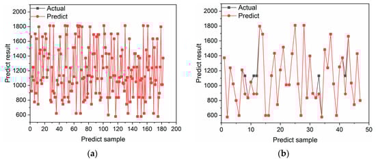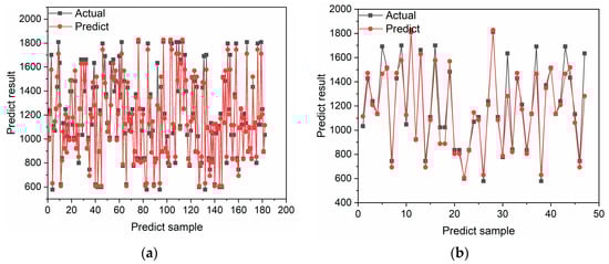 In this paper, the regression coefficient (R2), the average relative average error (MAE), and the absolute root-mean-square error (RMSE) of the test set are selected for error evaluation. The three errors of the different calculation models are shown in Table 5. In order to reflect the randomness of NOx data occurrence in practical applications and to calculate the prediction effect of the models, a dotted line plot is used to compare the true and predicted values. The results of the comparisons between the predicted and true values of the three models on the test and training sets are shown in Figure 8, Figure 9 and Figure 10.