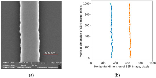 Commonly, the sidewall roughness of the waveguide is inherited during reactive ion etching from the edge roughness of the mask [36]. For this reason, in the paper, the LER of the waveguide was determined as the LER of the mask. As shown in [29], the chromium hard mask was used for the fabrication of waveguides on an LNOI substrate. For LER analysis, a top view image of the chromium mask was obtained using a scanning electron microscope (SEM) Tescan Mira3 (Figure 3). In addition, the same analysis of the sidewall roughness of the fabricated waveguide on the LNOI substrate is not possible due to its charging during SEM investigation.