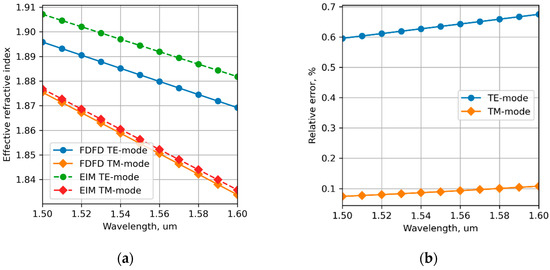 The obtained results of the EIM simulations are in good agreement with the results obtained with the accurate FDFD method for the considered waveguide cross-section, and the relative error of the effective refractive index calculation does not exceed 1% for both polarizations (Figure 5).