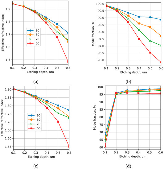 In simulations of single mode waveguides, the dependencies of the effective refractive index and polarization fraction along the x and y axes from the etching depth were studied at the wavelength 1.55 μm (see the waveguides cross-section parameters in Table 1). The simulation showed that with increase of etching depth, the effective refractive indexes of the TE- and TM-modes decrease to values close to the substrate refractive index (SiO2), and the polarization fraction of the TE-mode along the transverse axis decreases while the value for the TM-mode increases. However, the smaller the slope angle of sidewalls, the faster the effective refractive index and the fraction of polarization of the TE-mode decrease. In the case of the TM-mode, the slope angle of sidewalls affects the polarization fraction, limiting its maximum value (Figure 6).