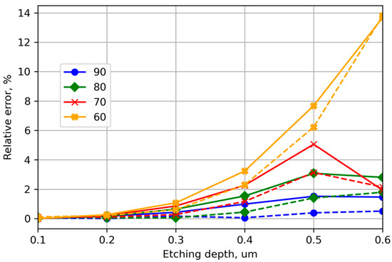 To evaluate the accuracy of EIM, the relative error of calculating the effective refractive indexes of the TE- and TM-modes by EIM and FDFD method was analyzed for the waveguides described in Table 1. As can be seen from Figure 8, the relative calculation error increases with an increase of the waveguide etching depth and with decrease of the sidewall slope angle. The plot shows that the calculation error of the effective refractive index by the EIM does not exceed 1% at the etching depths less than 0.3 μm and at the sidewall slope angle at least 70°.
