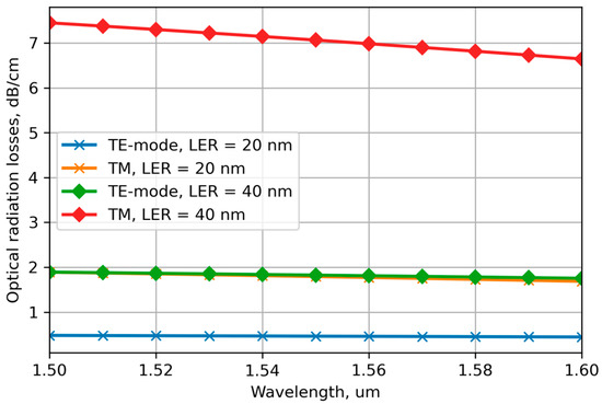After the EIM accuracy estimation, optical radiation loss could be calculated with the Payne–Lacey method. The calculation results are shown on Figure 9. As seen from the plot, the increase of LER from 20 to 40 nm leads to growth of radiation optical losses: from 0.5 to 1.8 dB/cm for the TE-mode, and from 1.8 to 7.1 dB/cm for the TM-mode at 1.55 μm. The longer the wavelength, the less sensitive it is to the sidewall roughness, resulting in lower optical radiation losses.