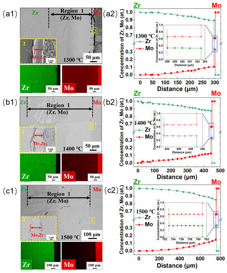 BSE images and EDX mapping of the entire diffused regions in Zr-Mo systems and the concentration distribution curve in the solid solution region after annealing at 1300–1500 °C for 5 h: (a1,a2), 1300 °C; (b1,b2), 1400 °C; (c1,c2), 1500 °C. The dashed square region 2 in (a1,b1,c1) represents the local enlarged images.