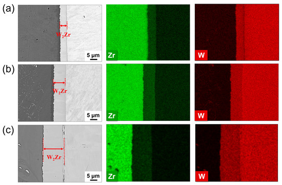 BSE images and EDX mapping of the entire diffused regions in Zr-W systems: (a), 1300 °C; (b), 1400 °C; (c), 1500 °C.