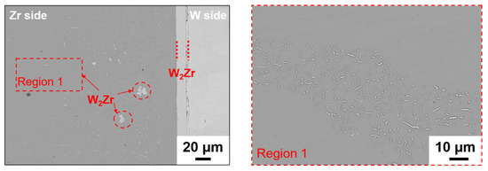 The thickness of the W2Zr layer was very thin and the increment with temperature was only a few microns. The thickness increased by ~7 μm when the diffusion temperature was increased from 1400 °C to 1500 °C, while it increased by only ~3.5 μm when the temperature increased from 1300 °C to 1400 °C. This was due to the high melting points of W (3410 °C) and Zr (1842 °C), which resulted in the weak ability of atomic migration under the heat activation effect. While the melting point of Mo (2610 °C) was lower than that of W, the Zr-Mo system required lower activation energy for diffusion. Moreover, the diffusion in the Zr-W system became multiphase diffusion of W-W2Zr-Zr as diffusion proceeded. The W2Zr phase could be observed on the Zr side at all temperatures in this work, e.g., the image of the Zr side at 1500 °C shown in Figure 4. This was dominated by two processes: (i) the initial diffusion was also controlled by vacancy mechanism, the Zr side could easily provide the vacancy for W atomic migration due to a lower melting point of Zr; and (ii) simultaneously, W2Zr formed by the assistance of the diffusion and reaction under thermal driving effect.