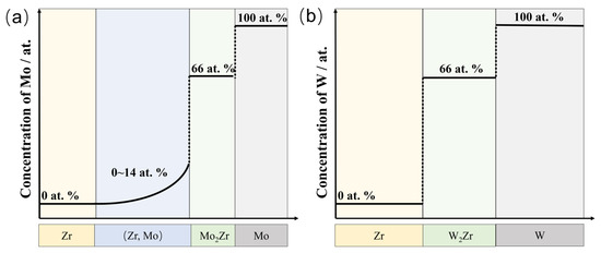 Schematic diagrams of the (a) Zr-Mo and (b) Zr-W diffusion region after diffusion at 1300–1500 °C.