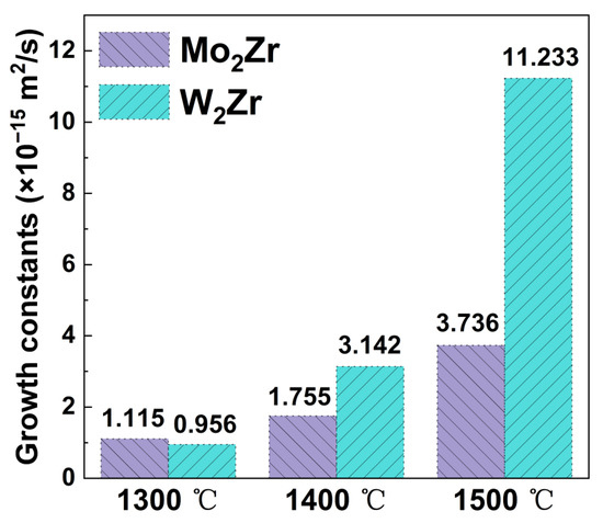 Growth constants of Mo2Zr and W2Zr (×10−15 m2/s).