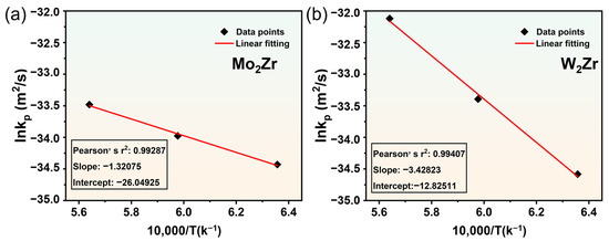 To quantitatively calculate the activation energy for growth of the Mo2Zr and W2Zr phases, the growth constant versus temperature was obtained as shown in Figure 7, with lnKp as the vertical coordinate and 10,000/T as the horizontal coordinate. The goodness of fit (r2) in both Figure 7a,b were over 0.99, which indicates that the values of the growth constants at each temperature were in accordance with the Arrhenius relationship [20,27]: