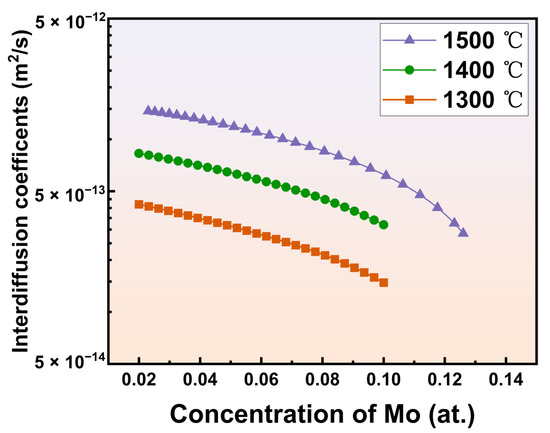The concentration-dependent interdiffusion coefficients calculated from Equation (4) for the (Zr, Mo) solid solution phase in the range of 1300–1500 °C are shown in Figure 8. The interdiffusion coefficient of the (Zr, Mo) solid solution was between 1.5 × 10−13 m2/s and 1.4 × 10−12 m2/s at 1300–1500 °C, which was two magnitudes larger compared to the growth constant of the Mo2Zr phase. Furthermore, the interdiffusion coefficient of the Zr-Mo system with the solid solution phase decreased with the increase of Mo content. At 1300 °C and Mo content of 0–10 at. %, the interdiffusion coefficient of (Zr, Mo) solid solution ranged from 1.5 × 10−13 m2/s to 4 × 10−13 m2/s; at 1400 °C and Mo content of 0–10 at. %, it ranged from 3.0 × 10−13 m2/s to 8.0 × 10−13 m2/s; at 1500 °C and Mo content of 0–10 at. %, it ranged from 2.8 × 10−13 m2/s to 1.4 × 10−12 m2/s. In general, the interdiffusion coefficient showed concentration dependence.